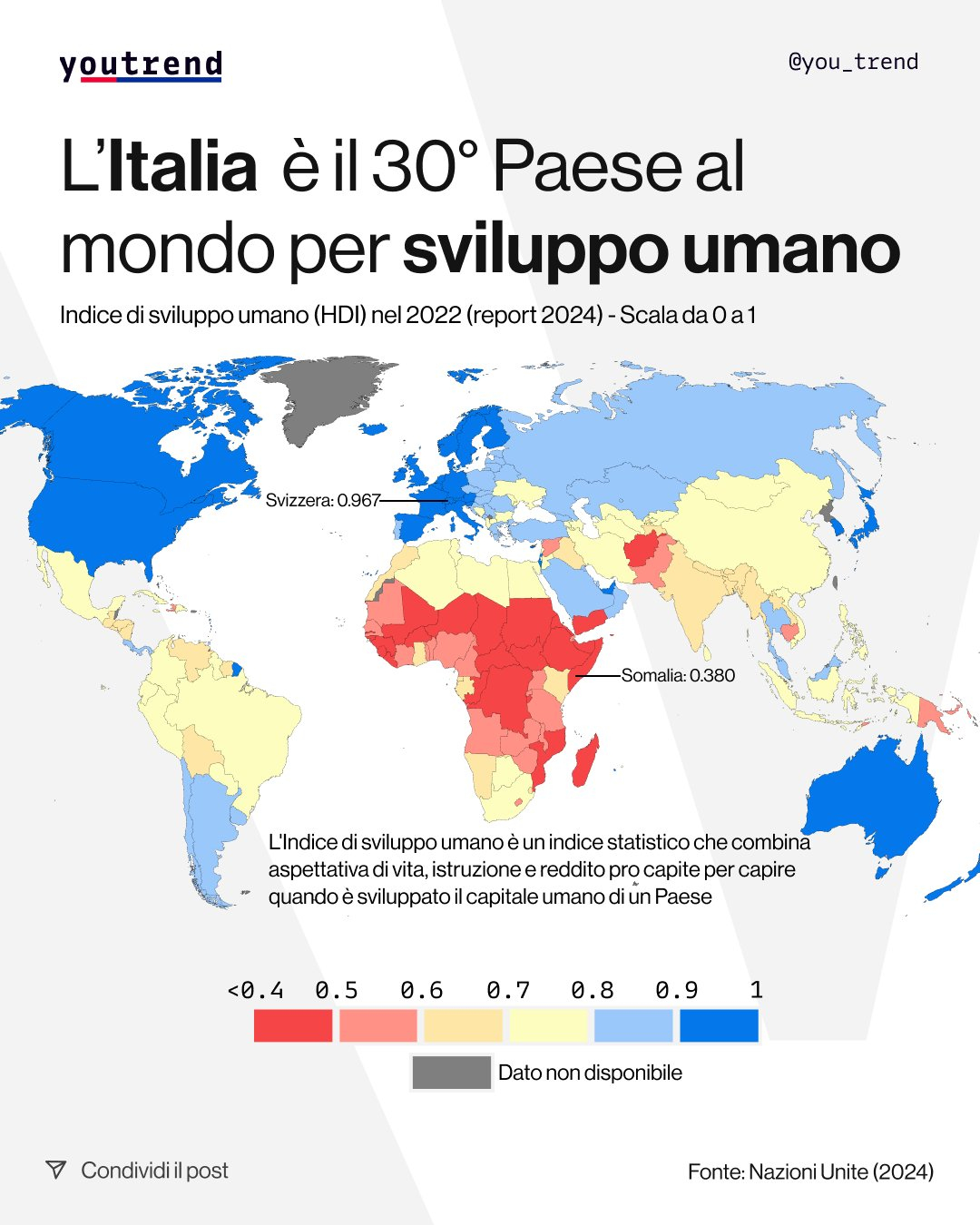 «La Svizzera è il Paese con l'Indice di sviluppo umano più alto. L’Italia si posiziona al 30° posto, dietro gli altri grandi Stati UE, cioè Germania (7°), Spagna (27°) e Francia (28°). Gli USA sono al 20° posto, mentre la Cina si ferma al 75°».