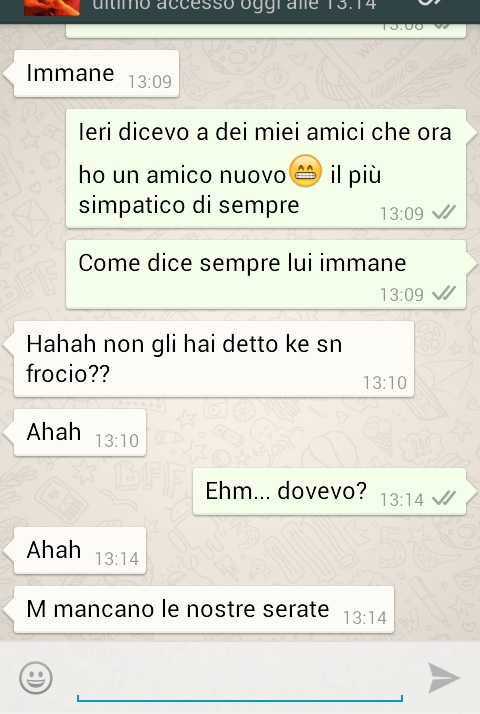 No praticamente no, e non c'è mai stata una cosa così diciamo questa alchimia... Cazzo cioè mi ha appena mandato un messaggio con scritto "ti stavo pensando TVB" io mi sciolgo ogni volta gli voglio troppo bene... Però come dice l'amico Sampei può essere che è un amico e tenerone etero... Ma perché comportarsi così cioè io mi monto solo la testa se è così... Mi disorienta...