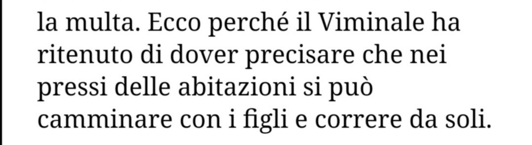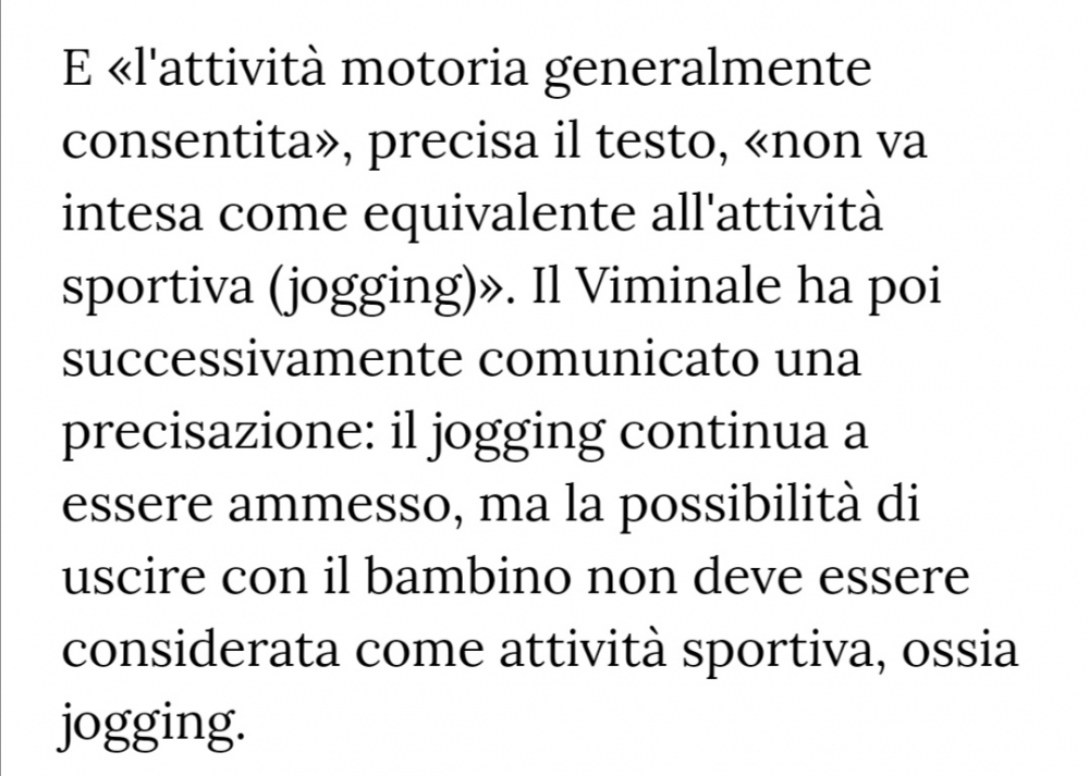 se per questo in un decreto conte c'era scritto che vietato fare jogging ma potevi fare attività sportiva e potevi portare il minore a spasso - vicino casa - ma senza che questa uscita fosse considerata una "attività motoria". Contemporaneamente potevi correre (da solo) e camminare coi bambini.