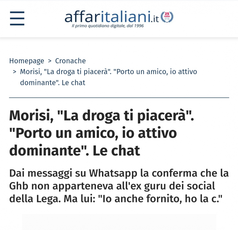 Almadel Posted October 6, 2021 Author Posted October 6, 2021 Gli escort hanno portato il GHB e Morisi ci ha messo la cocaina. Quote